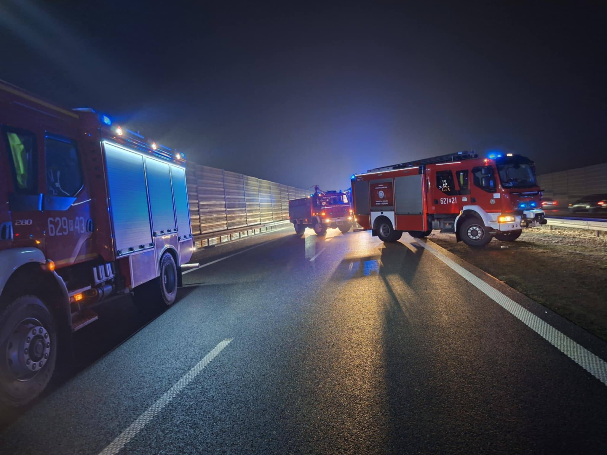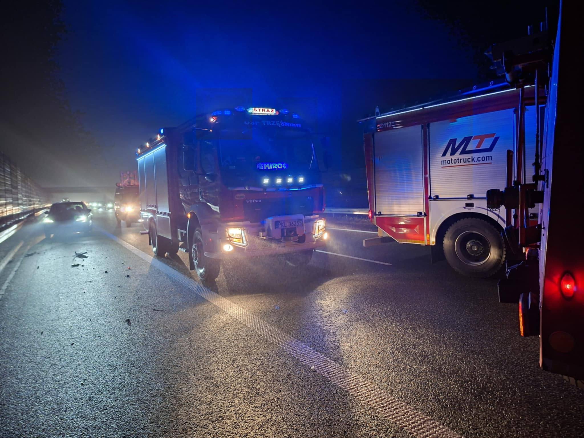 Powiatowe Stanowisko Kierowania Komendanta Powiatowego Państwowej Straży Pożarnej w Kole zadysponowało zastęp GBA VOLVO z OSP Trzęśniew do wypadku autobusu oraz samochodu osobowego na Autostradzie A2.